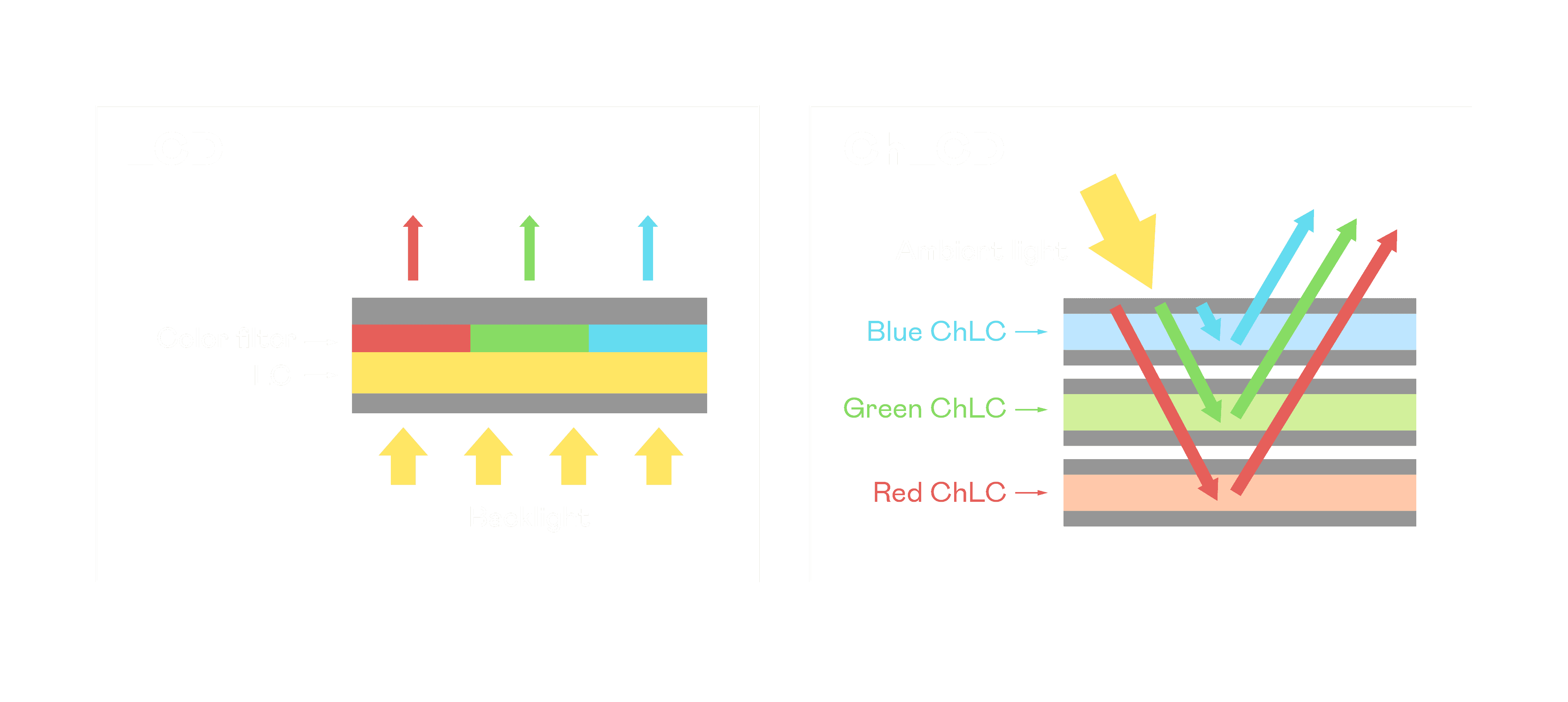 森林舞会胆固醇液晶显示器是由红、、、绿、、、、蓝三层胆固醇液晶面板堆叠而成,,,,并采用无彩色滤光片设计,,,减少环境光在反射过程中的损耗。。。